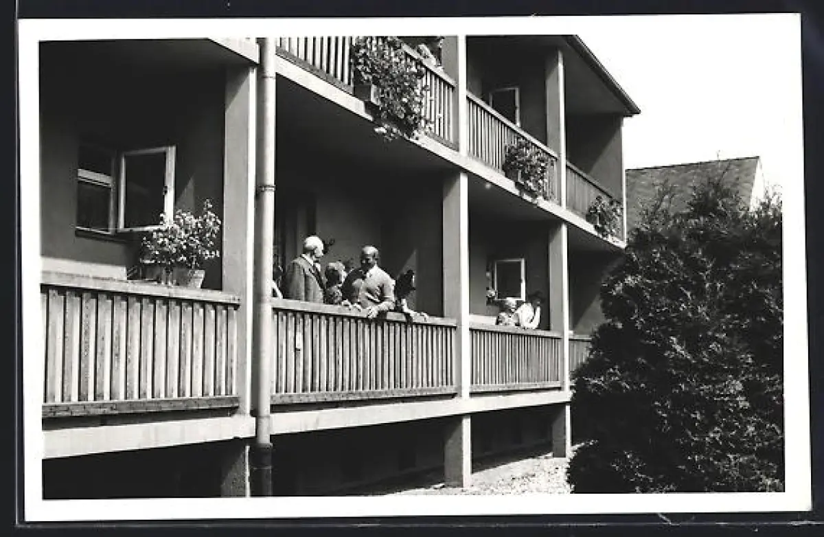 Foto-AK Leoben, Altenheim, Teilansicht mit Bewohnern auf Balkonen