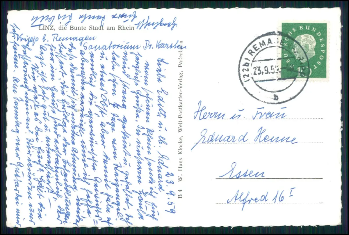 Rückseite beschrieben, Poststempel Remagen 1958, saubere Erhaltung.