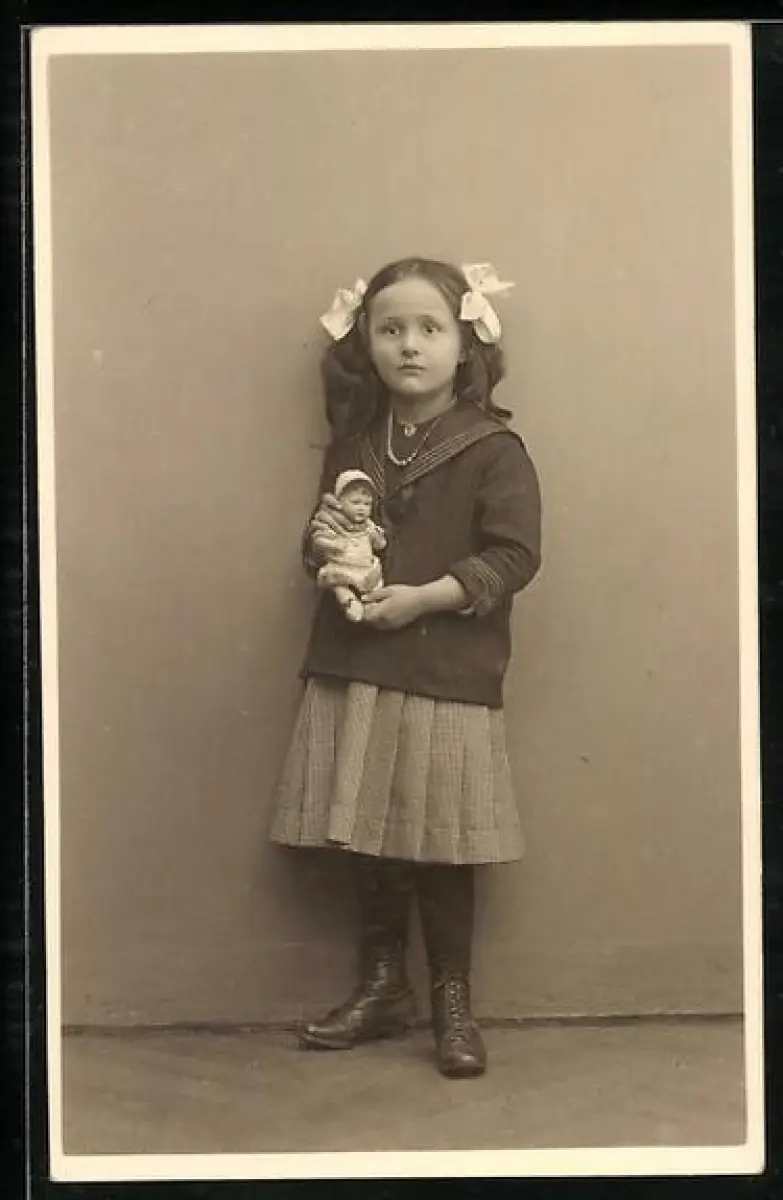 Foto-AK Mädchen in Matrosenbluse mit Puppe