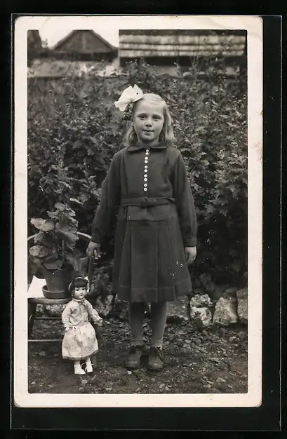 Foto-AK Mädchen mit Haarschleife und Puppe in einem Garten