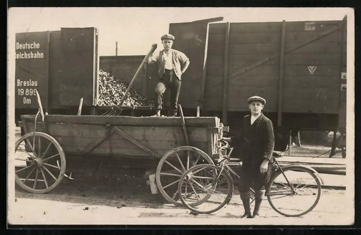Foto-AK Mann mit Fahrrad vor einem Güterwaggon