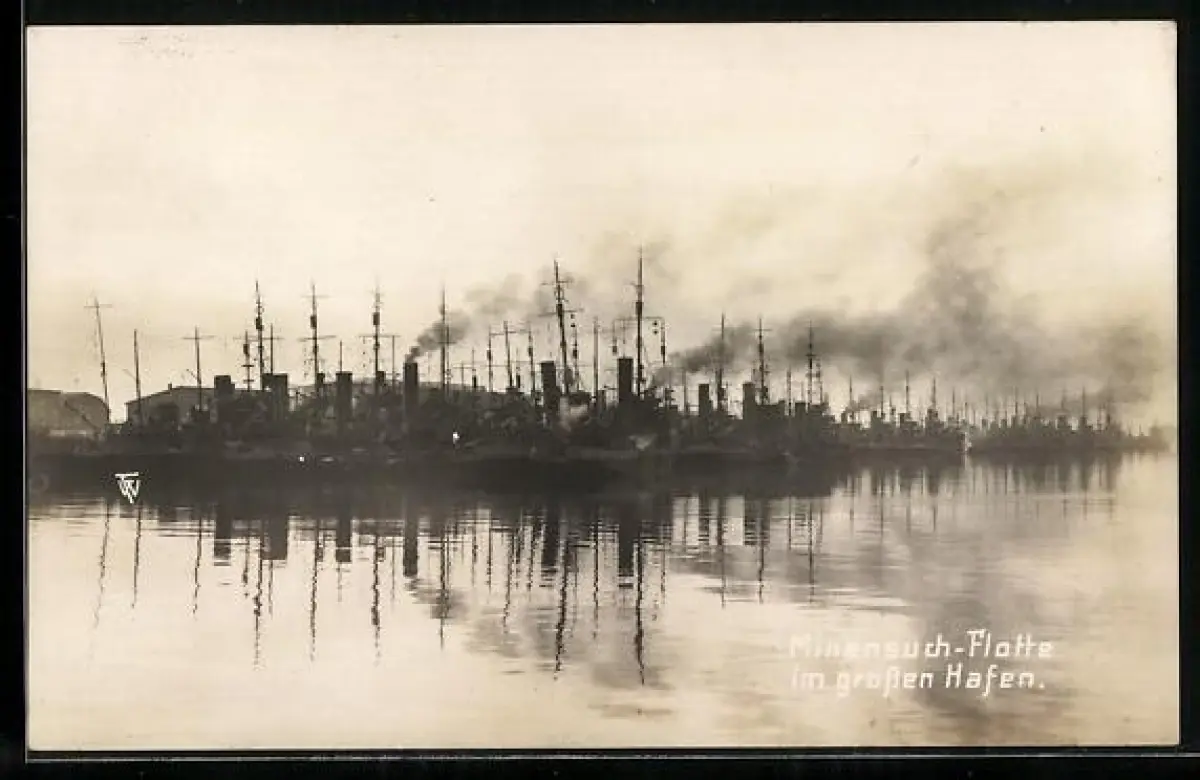 Foto-AK Minensucher-Flotte im Hafen im Päckchen liegend