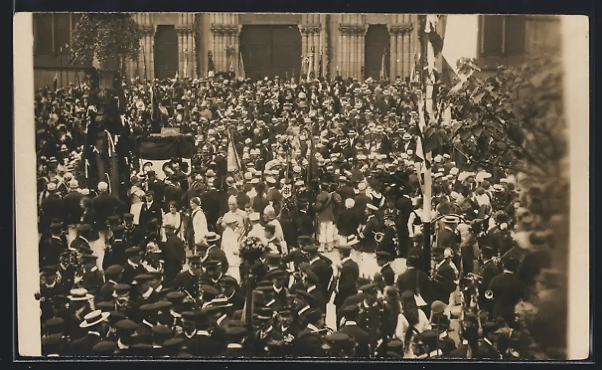 Foto-AK Mülhausen, Foule rassemblée devant une cathédrale pour une cérémonie solennelle