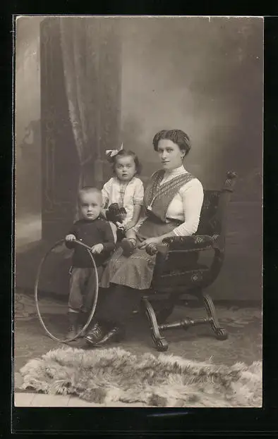 Foto-AK Mutter mit Kindern und Spielreifen in Studiokulisse
