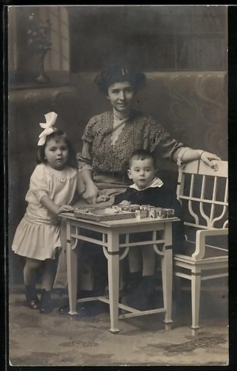 Foto-AK Mutter mit ihren zwei Kinder an einem Tisch 1915, Bauklötze auf dem Tisch