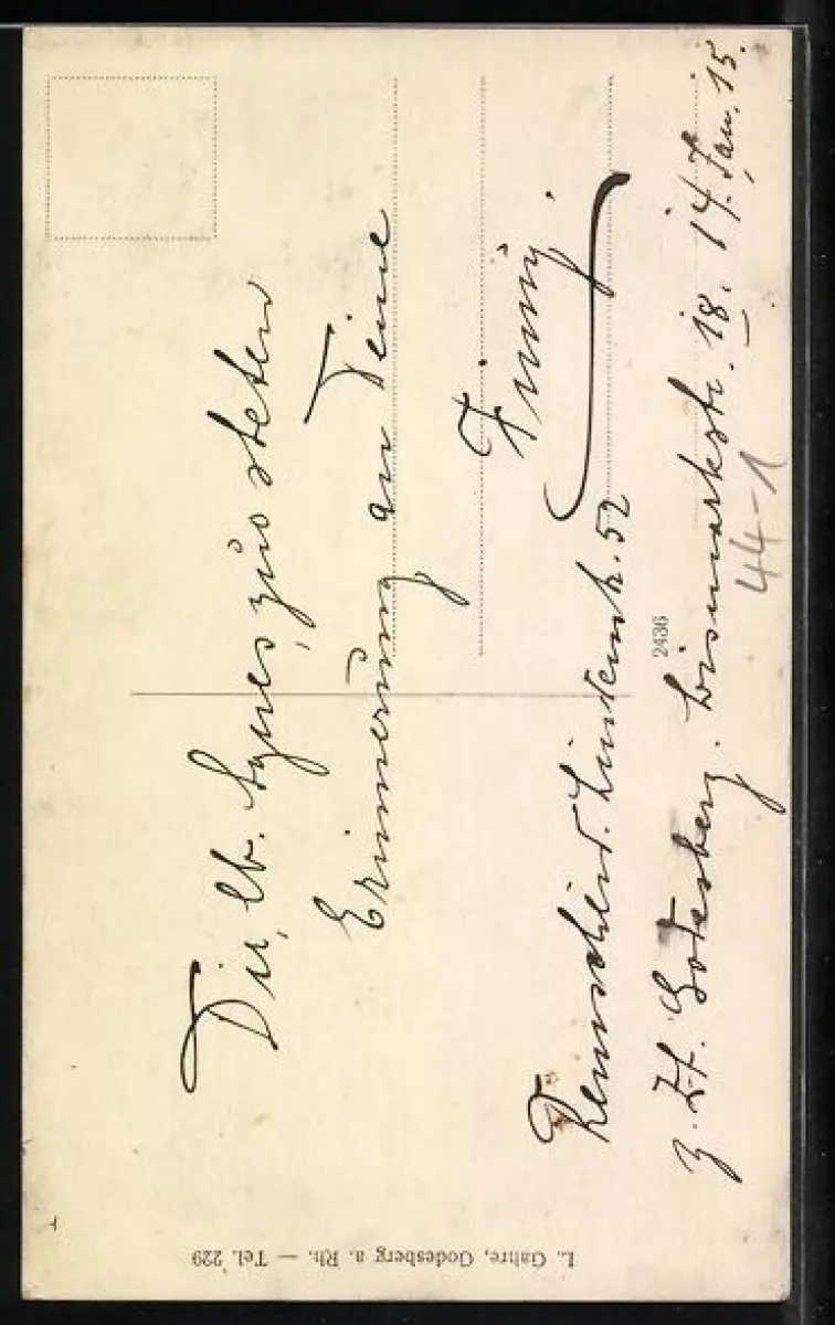 Personenbezogene Daten auf der Rückseite der Karte wurden durch blauen Textmarker unkenntlich gemacht. Die blauen Stellen sind auf die Vorderseite durchgeweicht und wirken sich negativ auf das Postkartenfoto aus