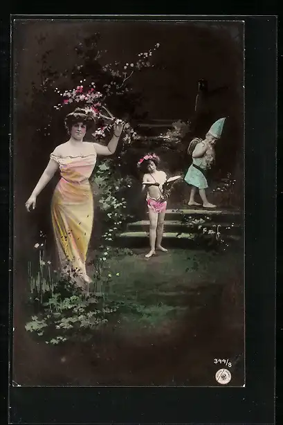 Foto-AK NPG: Dame unter blühendem Baum, junger Zwerg beobachtet das Kind mit Blumenkranz