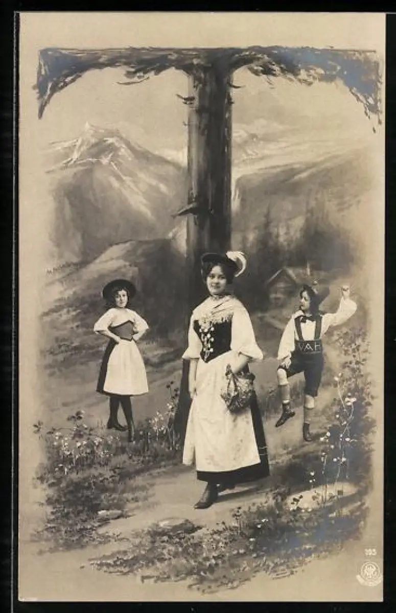 Foto-AK NPG NR: 195, Buchstabe T, Drei Kinder in Trachten
