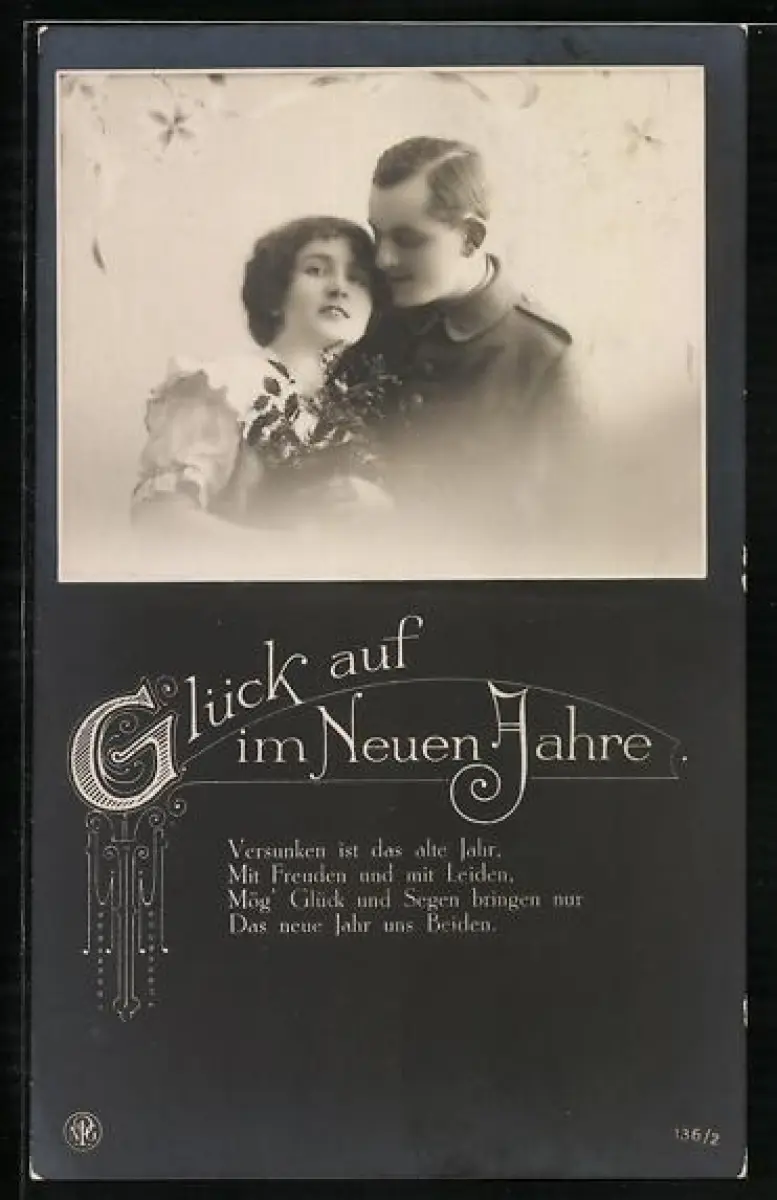Foto-AK NPG Nr. 136/2: Soldat in Uniform mit Frau, Neujahrsgruss