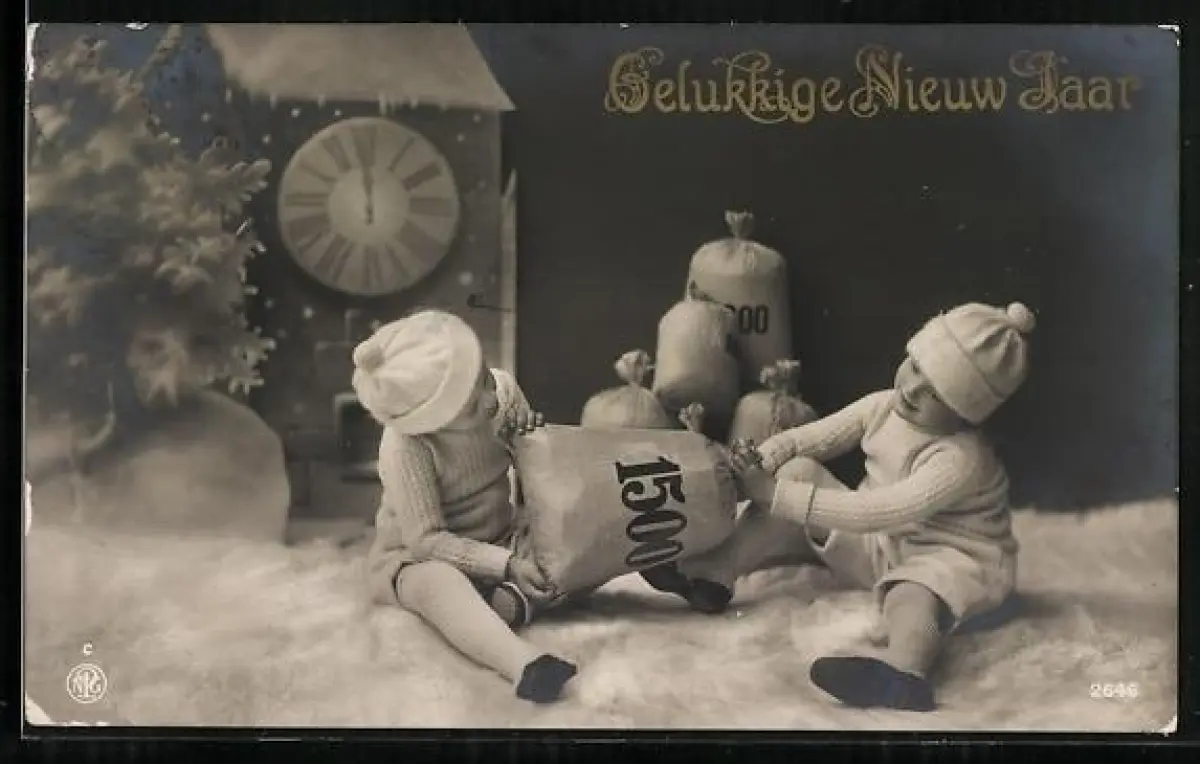 Foto-AK NPG Nr. 2646: Zwei Kinder mit Zipfelmützen beim Spiel mit Geldsäcken, Neujahrsgruss
