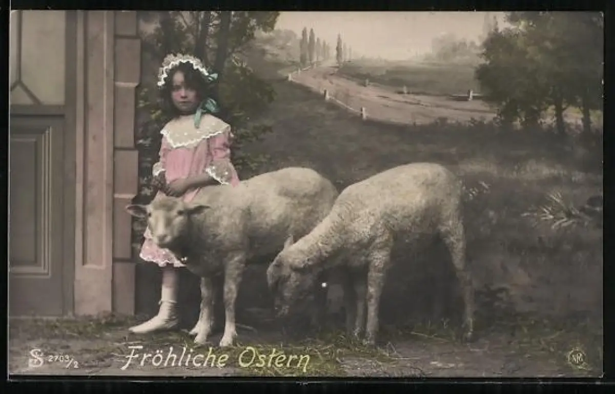 Foto-AK NPG Nr. 2703/2: Kleines Mädchen und Schafe vor Landschaftskulisse, Ostergruss