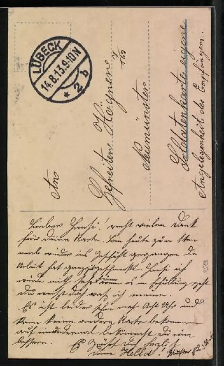Personenbezogene Daten auf der Rückseite der Karte wurden durch blauen Textmarker unkenntlich gemacht. Die blauen Stellen sind auf die Vorderseite durchgeweicht und wirken sich negativ auf das Postkartenfoto aus