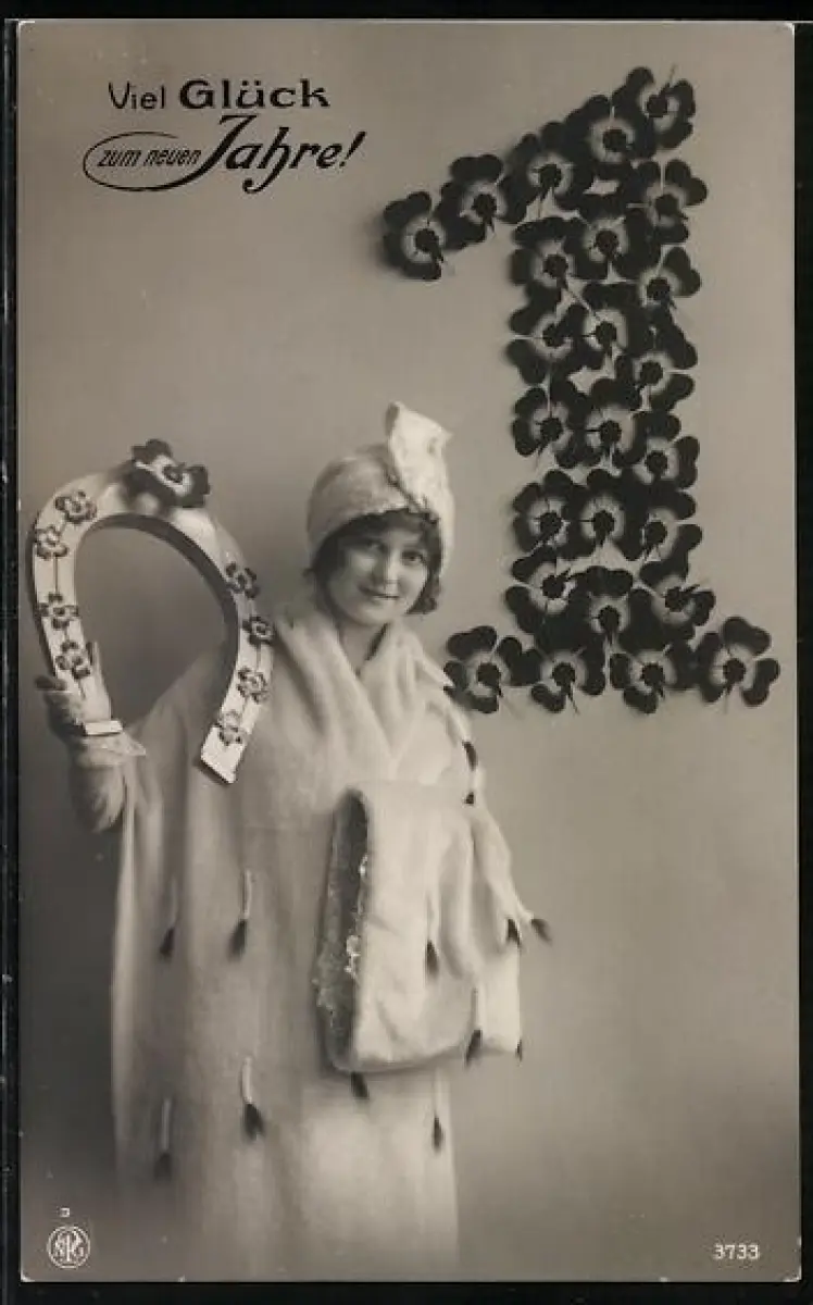 Foto-AK NPG Nr. 3733: Fräulein mit Hufeisen vor Zahl eins, Neujahrsgruss