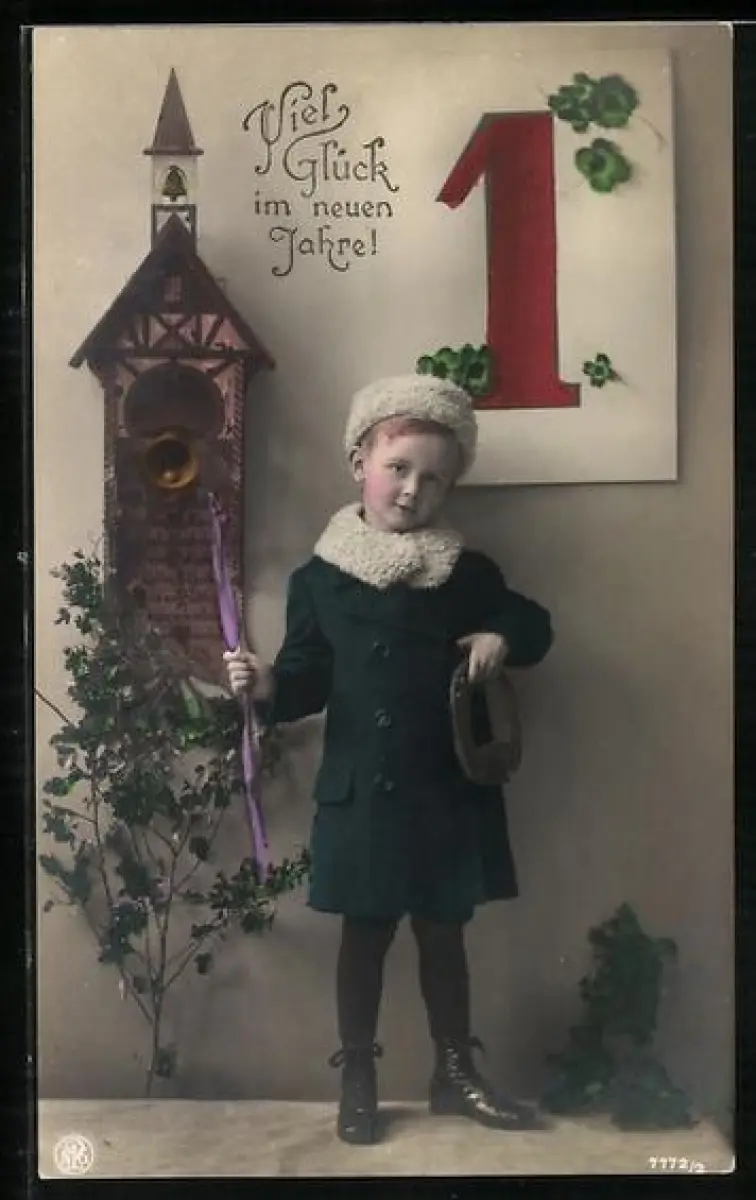 Foto-AK NPG Nr. 7772/2: Junge im Mantel vor Kalender, Neujahrsgruss