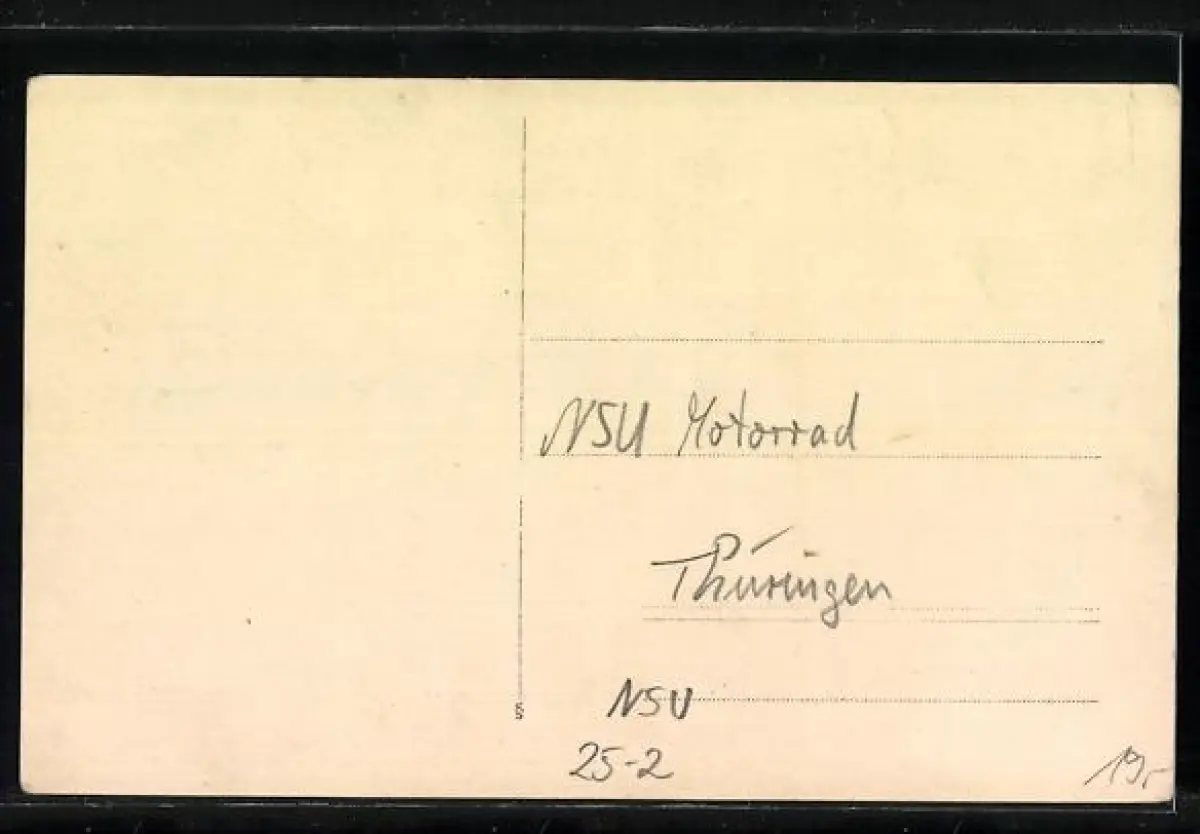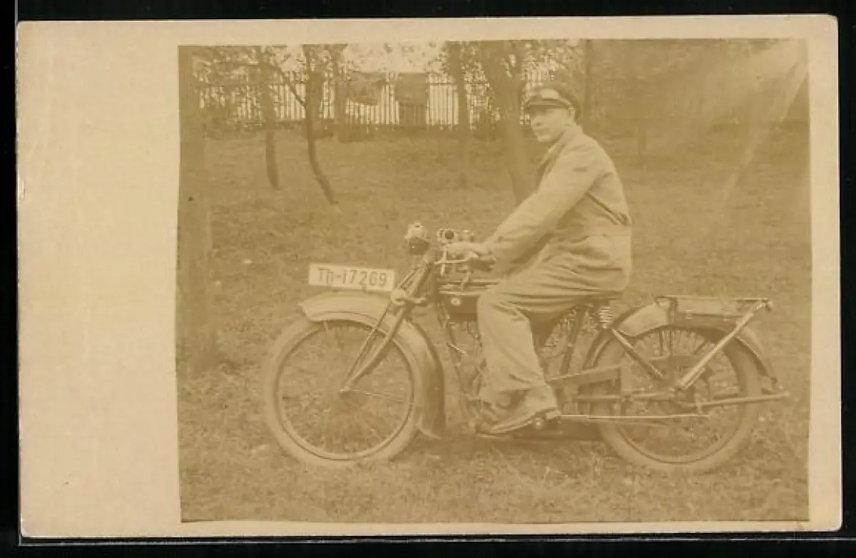 Foto-AK NSU Motorrad mit Nummernschild Th-17269 in einem Garten