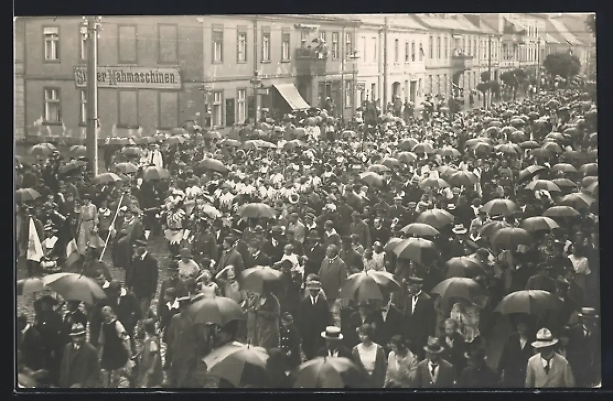 Foto-AK Neuruppin, Stadtfest, Strassenpartie mit Menschenmenge mit Regenschirmen vor Nähmaschinengeschäft, 1922