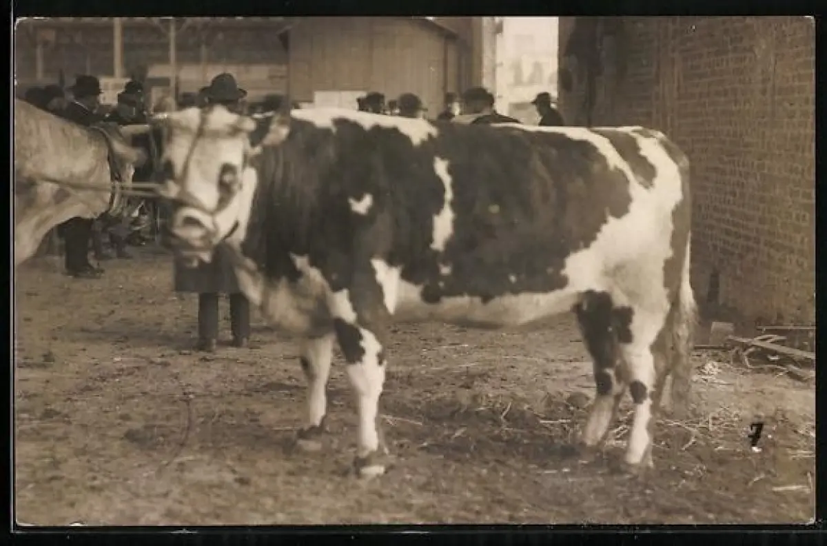 Foto-AK Ochsen, Käufer u. Verkäufer in einem Stallgebäude