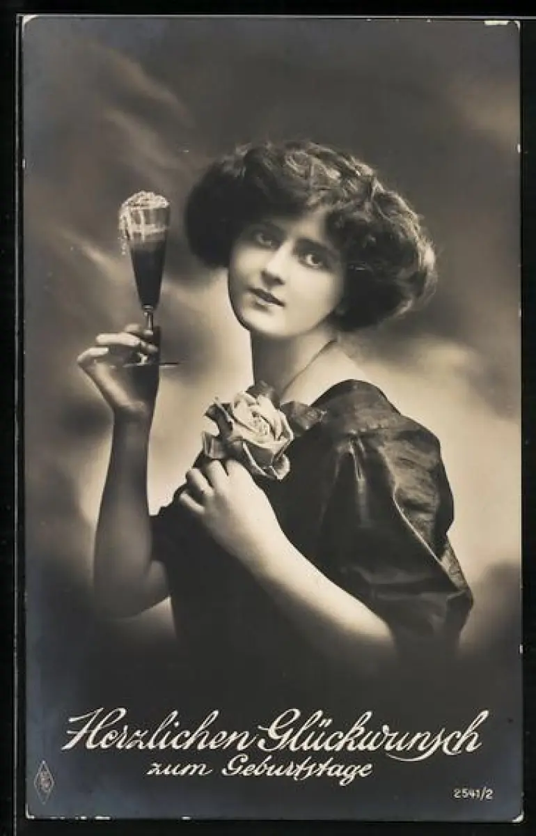 Foto-AK PFB Nr. 2541/2: Junge Frau mit Sektglas in der Hand, Herzlichen Glückwunsch zum Geburtstag