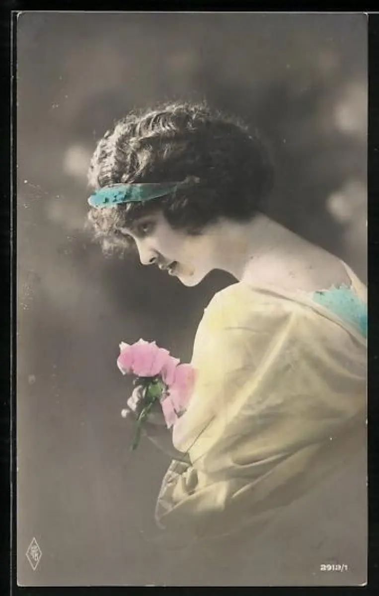 Foto-AK PFB Nr. 2912/1: Verträumte junge Dame betrachtet eine Rose