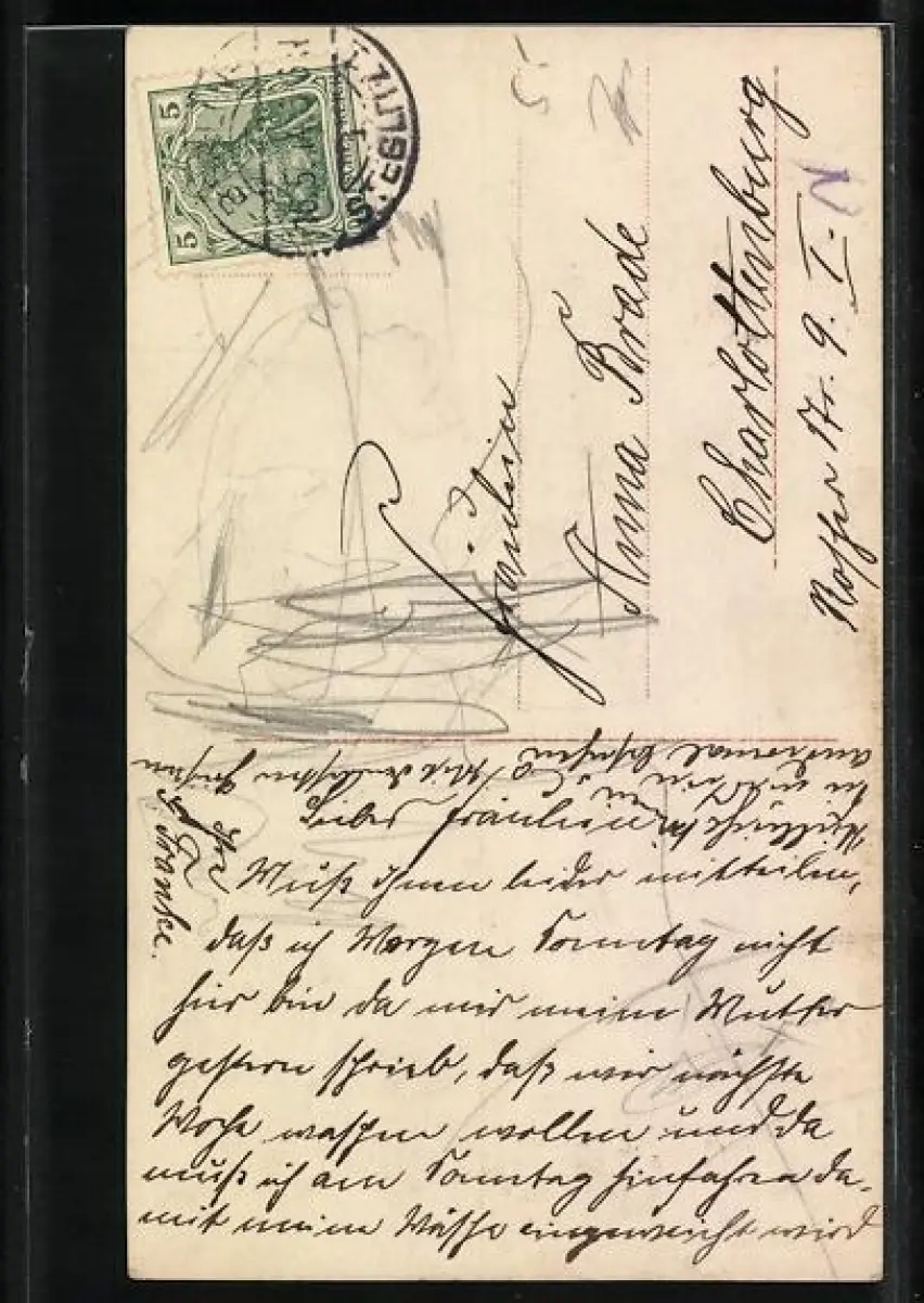 Personenbezogene Daten auf der Rückseite der Karte wurden durch blauen Textmarker unkenntlich gemacht. Die blauen Stellen sind auf die Vorderseite durchgeweicht und wirken sich negativ auf das Postkartenfoto aus