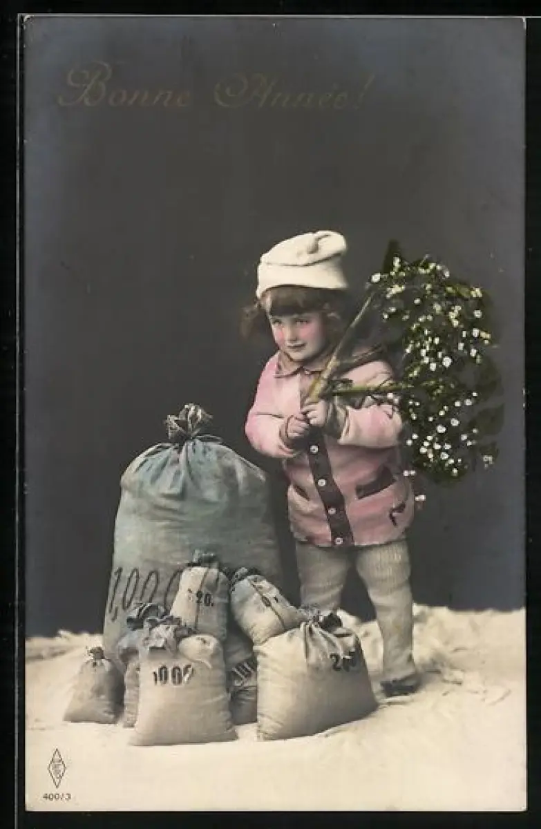 Foto-AK PFB Nr. 400/3: Mädchen mit Mistelzweig und Geldsäcken, Bonne Année!