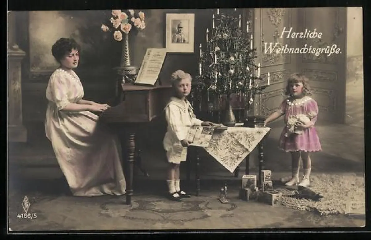 Foto-AK PFB Nr. 4166/5: Mutter sitzt am Klavier und Kinder betrachten ihre Geschenke, Herzliche Weihnachtsgrüsse