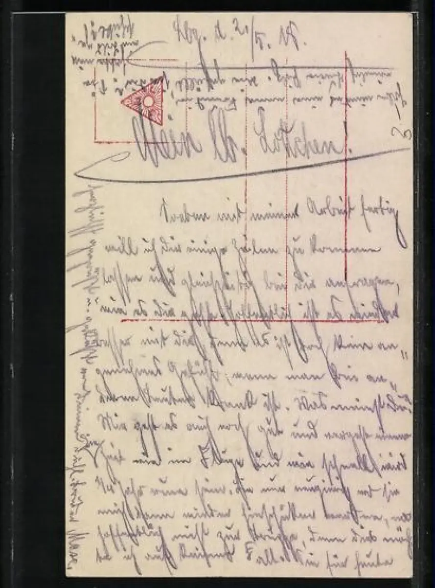 Personenbezogene Daten auf der Rückseite der Karte wurden durch blauen Textmarker unkenntlich gemacht. Die blauen Stellen sind auf die Vorderseite durchgeweicht und wirken sich negativ auf das Postkartenfoto aus