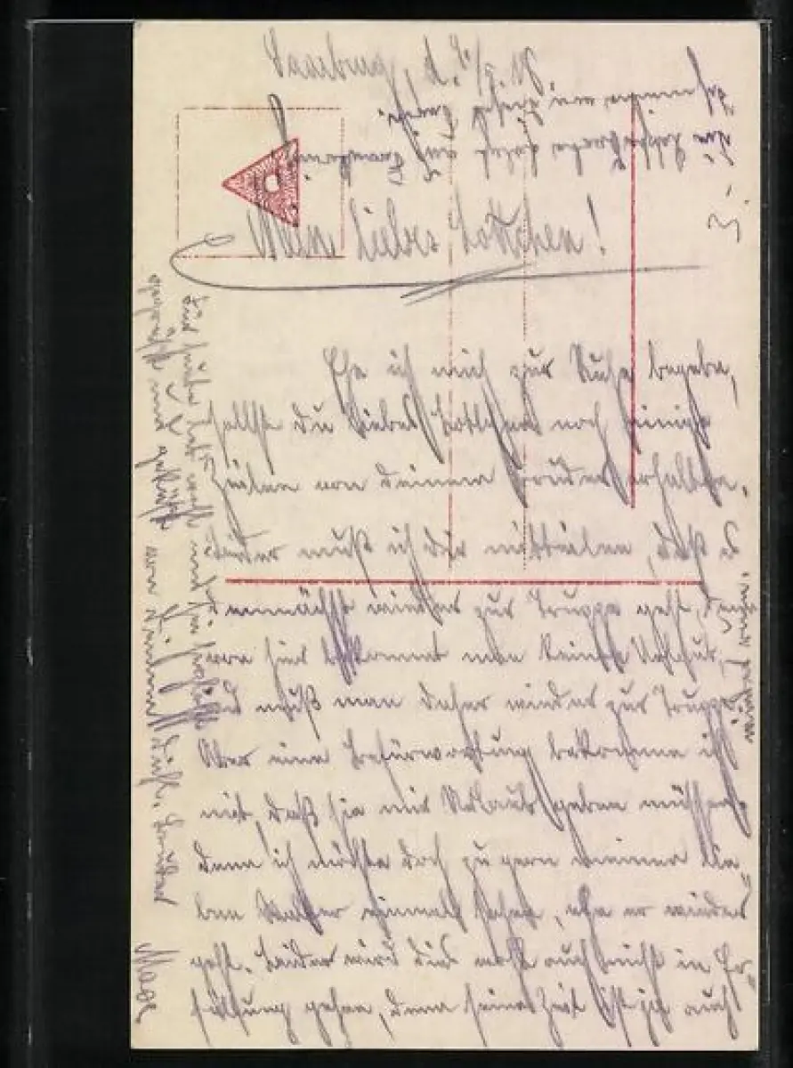Personenbezogene Daten auf der Rückseite der Karte wurden durch blauen Textmarker unkenntlich gemacht. Die blauen Stellen sind auf die Vorderseite durchgeweicht und wirken sich negativ auf das Postkartenfoto aus