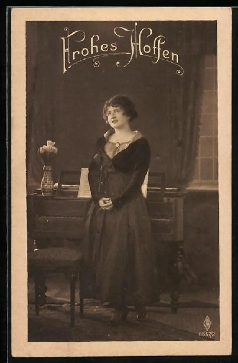 Foto-AK PFB Nr. 4657/2: Verträumte junge Dame steht am Klavier, Frohes Hoffen