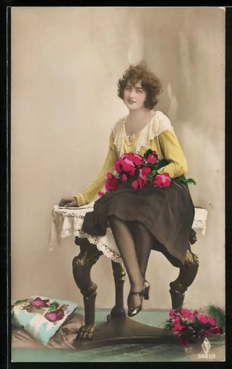 Foto-AK PFB Nr. 5081/2: Junge Dame mit Rosenstrauss in der Hand auf einem Tisch sitzend