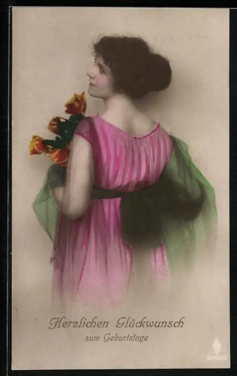 Foto-AK PFB Nr. 5093/2: Junge Dame blickt über die Schulter, Herzlichen Glückwunsch zum Geburtstag