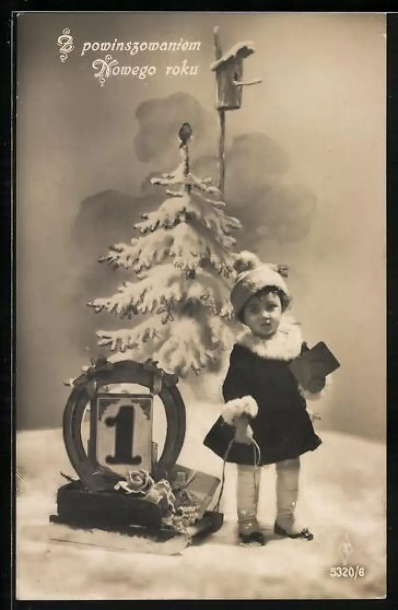 Foto-AK PFB Nr. 5320/6: Mädchen zieht einen Schlitten mit dem Kalenderblatt 1