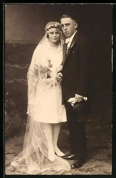 Foto-AK Paar in Hochzeitskleidung mit Handschuhen