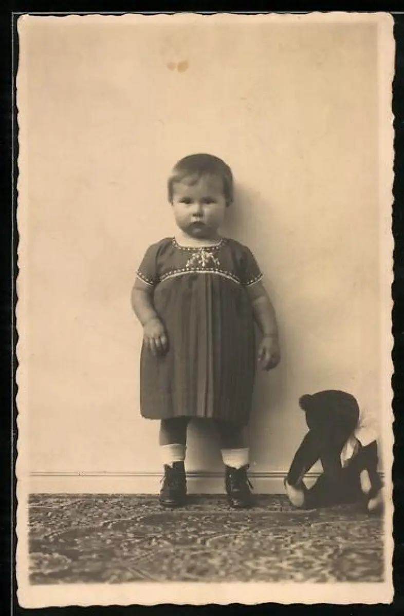 Foto-AK Pausbäckiges Kind steht neben seinem Teddybären