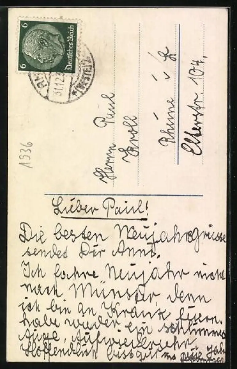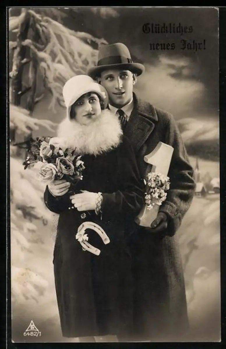 Foto-AK Photochemie Berlin NR 6482 /1: Paar mit Blumen und Hufeisen, Neujahr