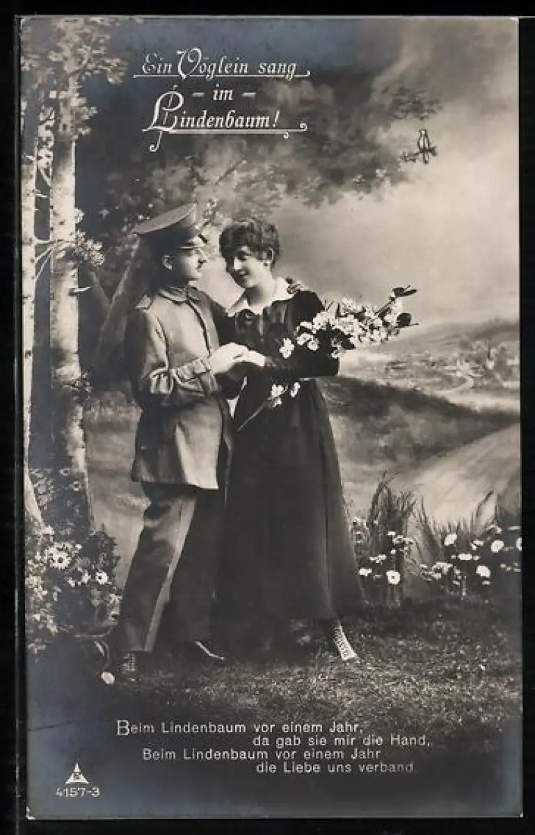 Foto-AK Photochemie Berlin Nr. 4157-3: Frau und Soldat stehen Arm in Arm unter einem Lindenbaum