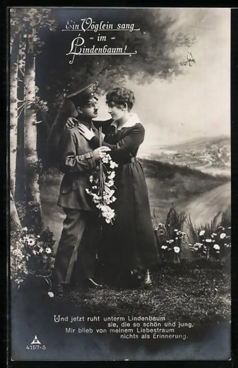 Foto-AK Photochemie Berlin Nr. 4157-5: Frau und Soldat stehen unter einem Lindenbaum