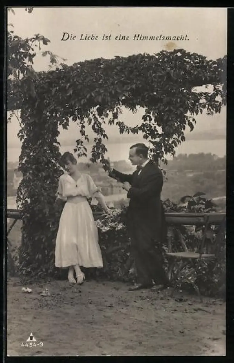 Foto-AK Photochemie Berlin Nr. 4454-3: Frau und Mann von Ranken umrahmt, Die Liebe ist eine Himmelsmacht
