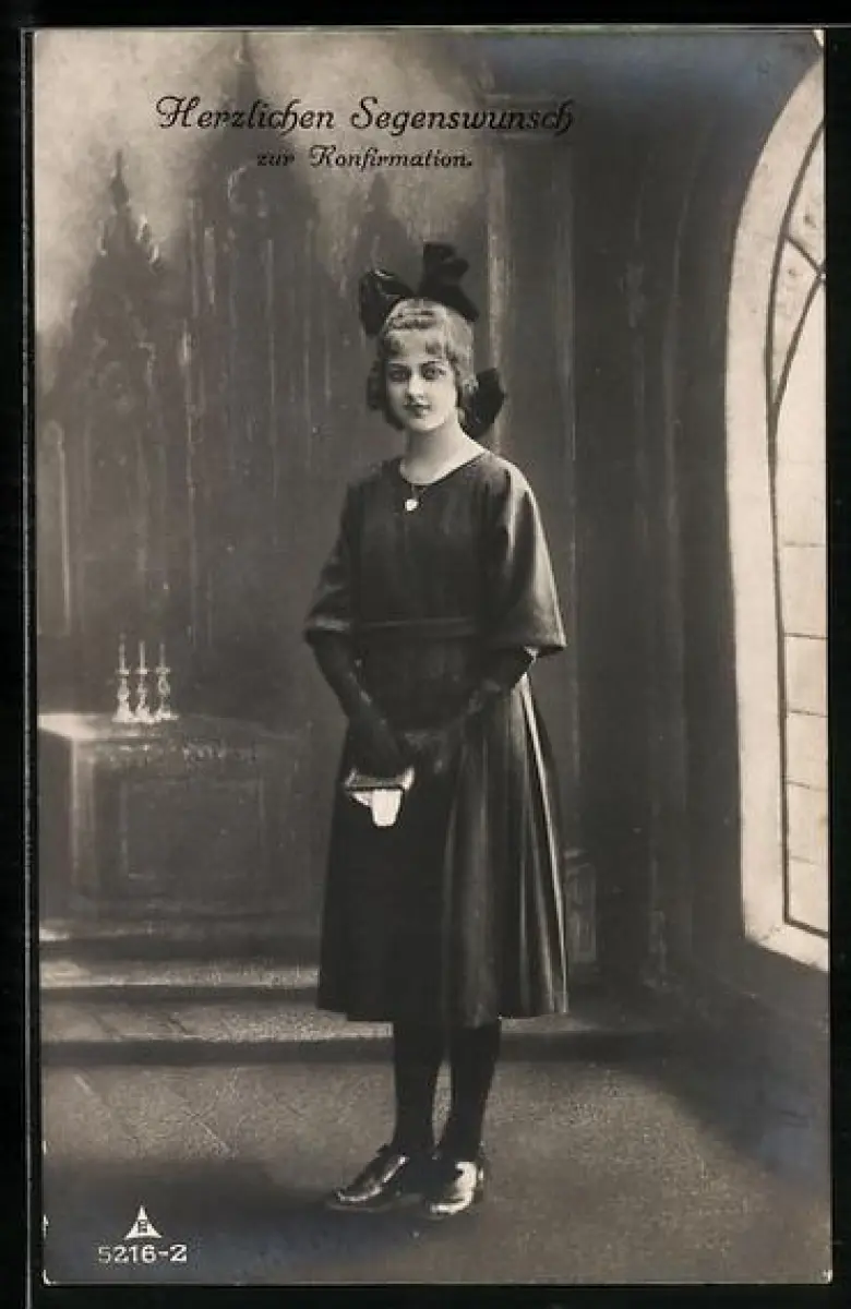 Foto-AK Photochemie Berlin Nr. 5216-2: Herzlichen Segenswunsch zur Konfirmation, Mädchen in schwarz in der Stube