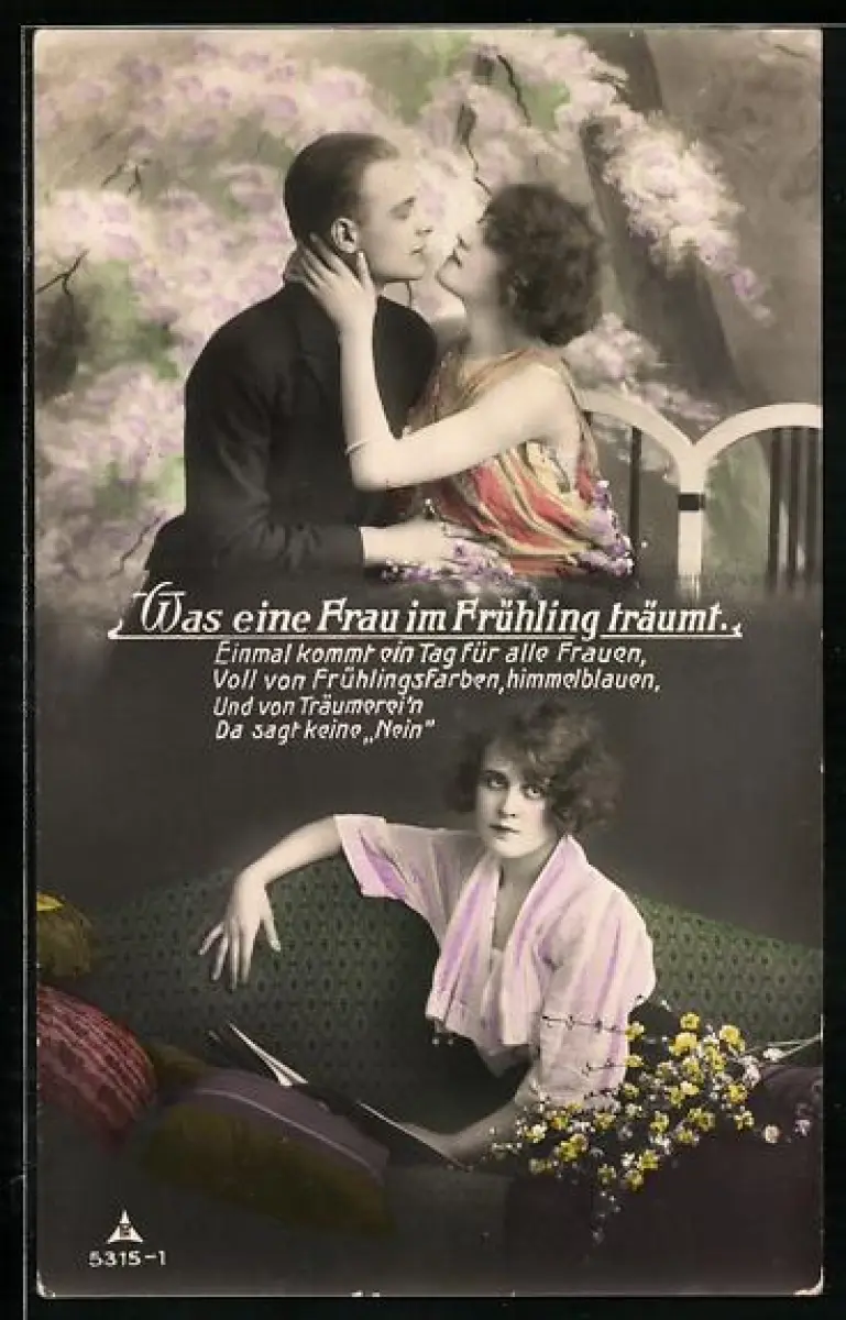 Foto-AK Photochemie Berlin Nr. 5315-1: Was eine Frau im Frühling träumt, Paar auf Parkbank, Dame in der Stube