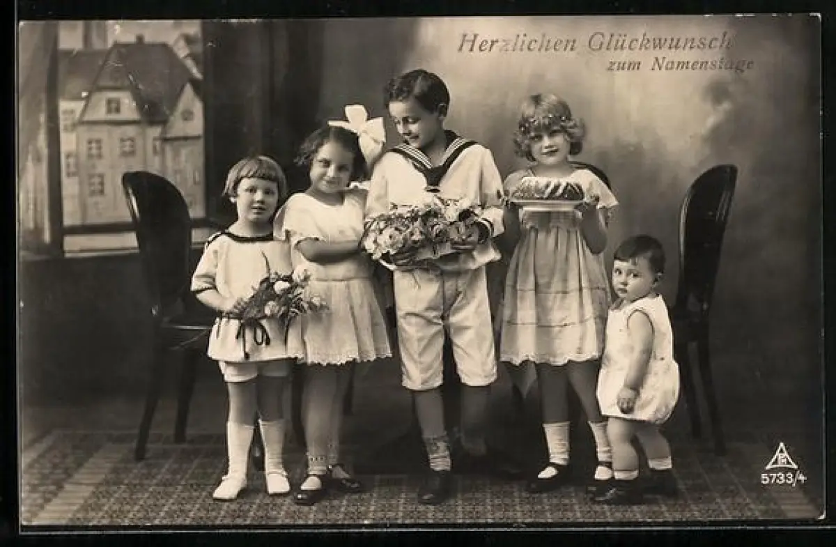 Foto-AK Photochemie Berlin Nr. 5733 /4: Wir gratulieren zum Geburtstage!, Kinder mit Geschenken