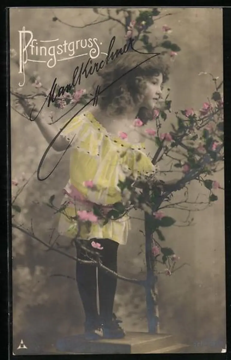 Foto-AK Photochemie Berlin Nr. 583-1: Kind in gelbem Kleid sendet Pfingstgrüsse