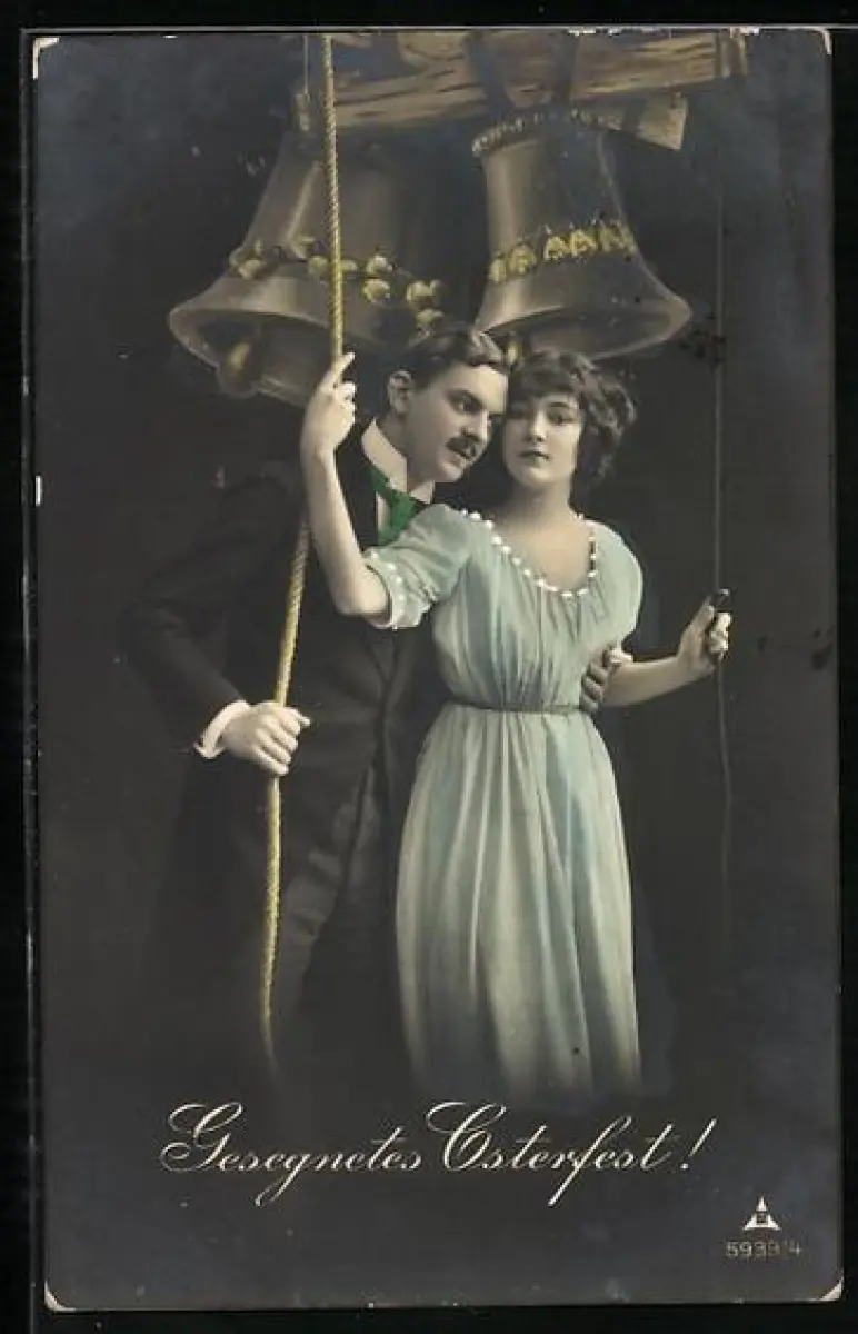 Foto-AK Photochemie Berlin Nr. 5939-4: Mann und Frau mit Glocken senden Ostergrüsse