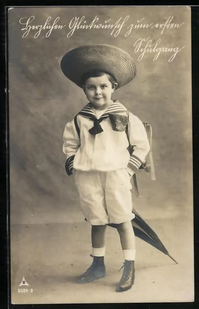 Foto-AK Photochemie Berlin Nr. 6004-3: Kind mit Regenschirm und lustigem Hut hat die Hände in den Taschen