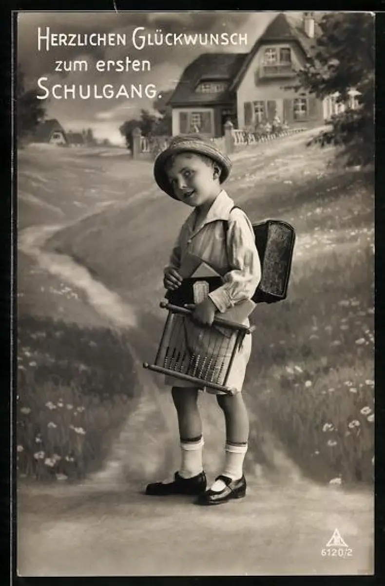 Foto-AK Photochemie Berlin Nr. 6120/2: Erster Schultag, Junge mit Tornister und Rechenbrett