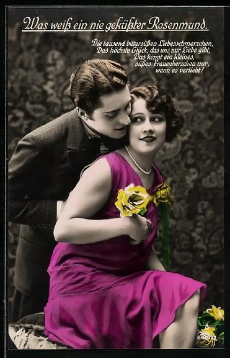 Foto-AK Photochemie Berlin Nr. 6810/2: Liebespaar in Umarmung, Was weiss ein nie geküsster Rosenmund