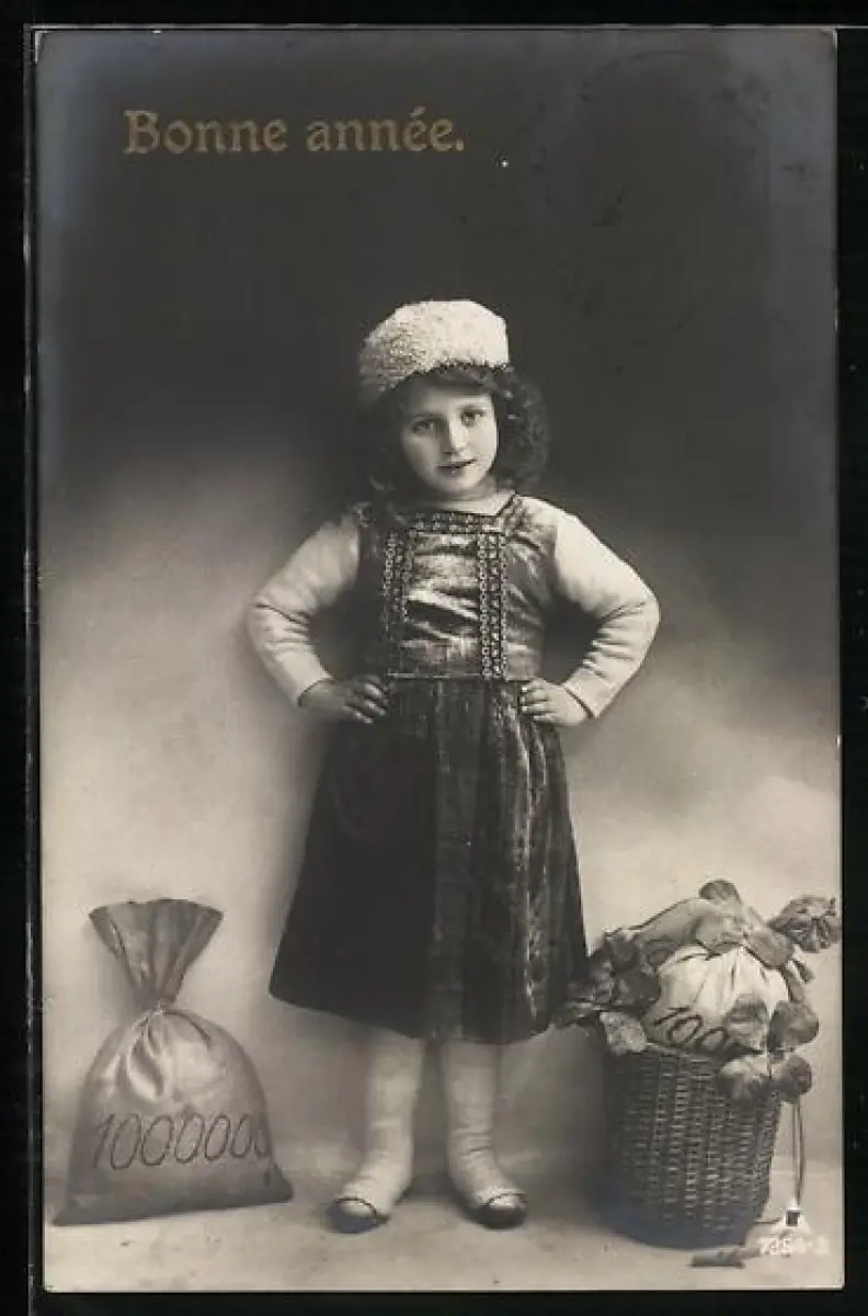 Foto-AK Photochemie Berlin Nr. 7264-3: Mädchen mit Säcken voller Geld wünscht ein frohes neues Jahr