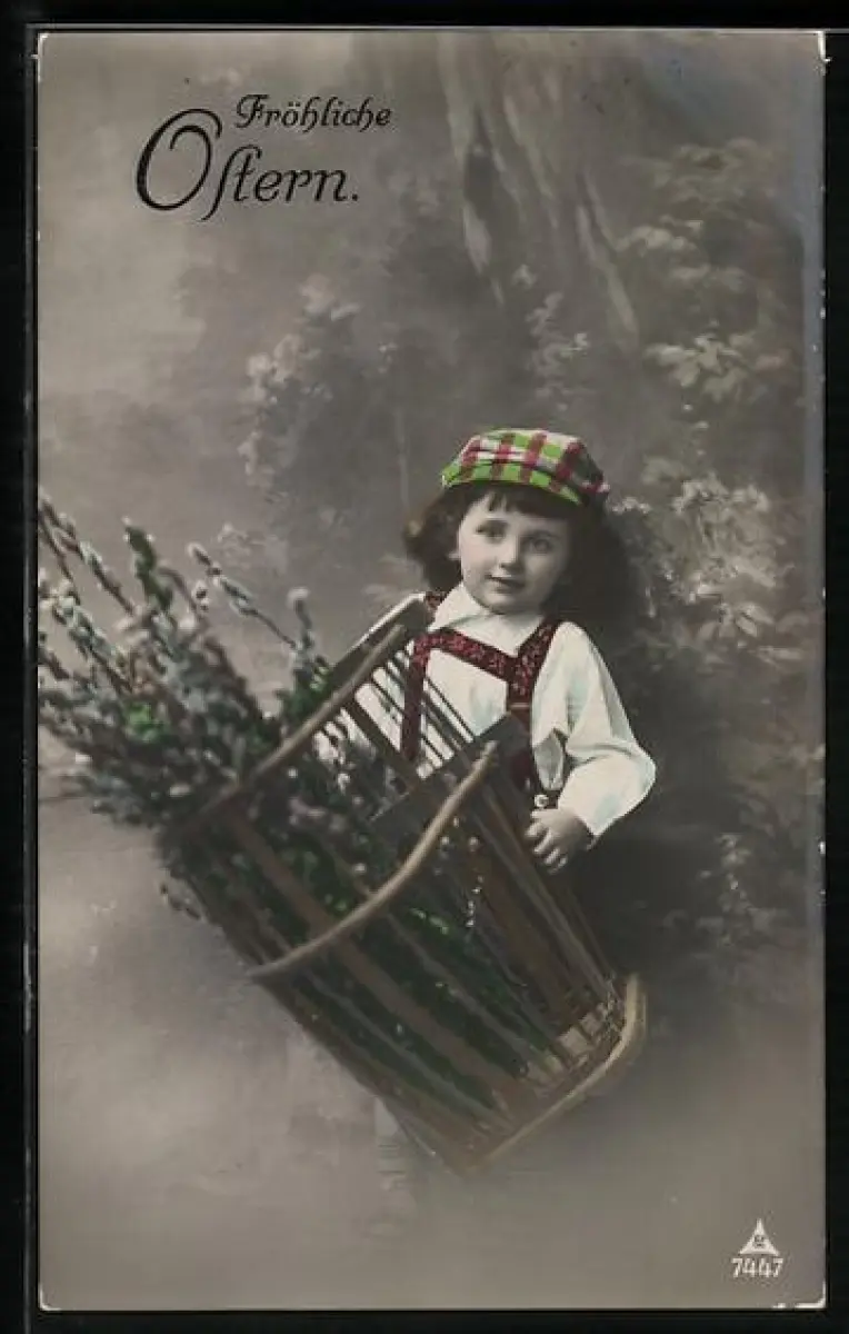 Foto-AK Photochemie Berlin Nr. 7447: Kind mit Korb voller Weidenzweige wünscht fröhliche Ostern