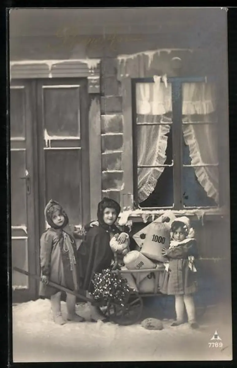Foto-AK Photochemie Berlin Nr. 7789: Drei Kinder mit Geldsäcken wünschen ein frohes neues Jahr
