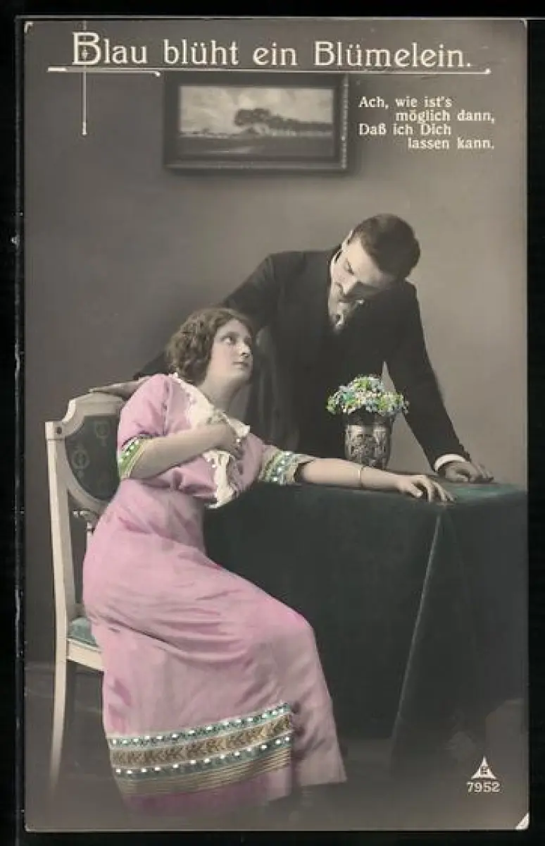 Foto-AK Photochemie Berlin Nr. 7952: Ehepaar zu Tisch, Blau blüht ein Blümelein